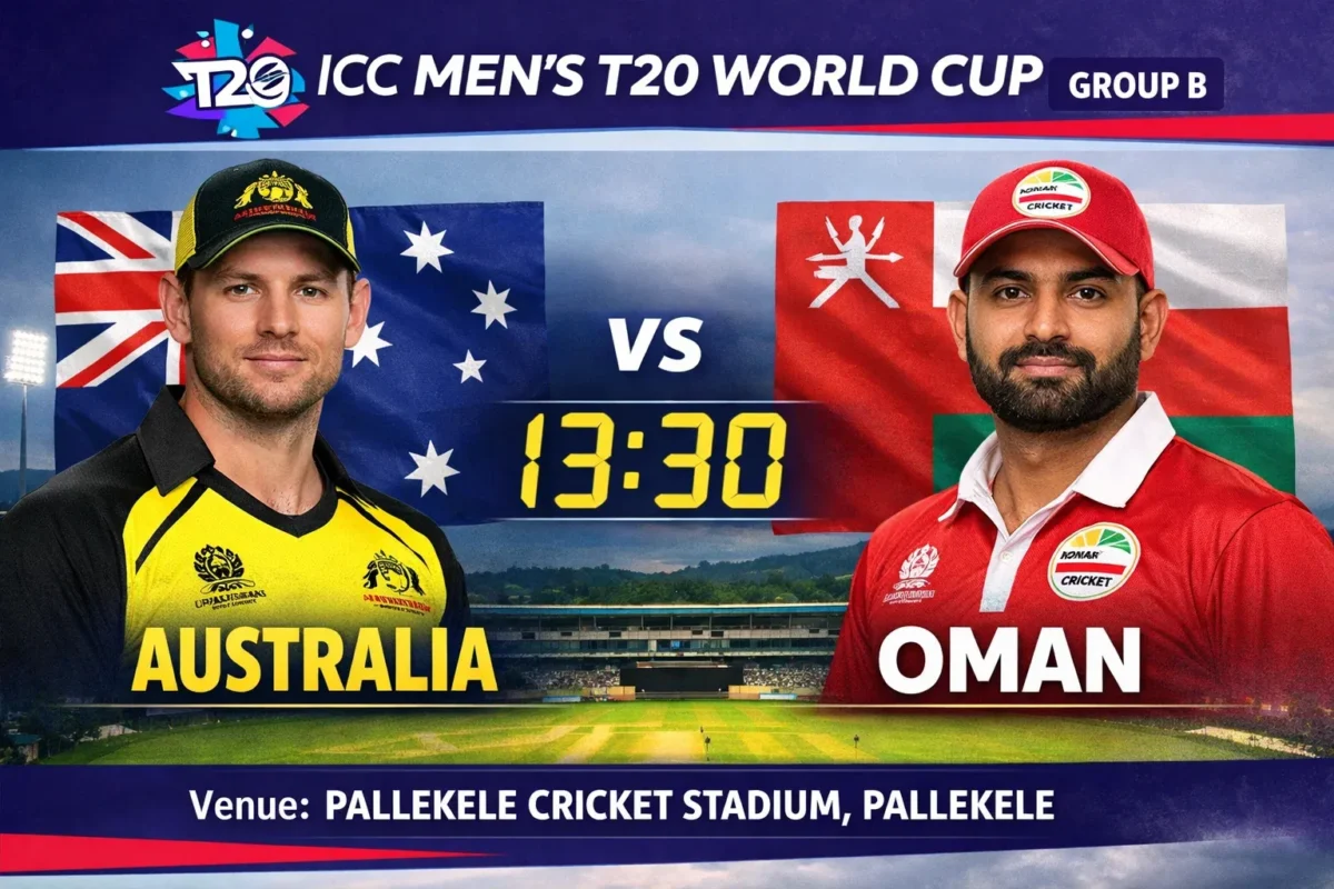 Match: Australia vs Oman | ICC Men’s T20 World Cup 2026 – Group B Date & Time: Friday, February 20 | 13:30 Local / 07:00 PM IST Venue: Pallekele International Cricket Stadium, Pallekele, Sri Lanka